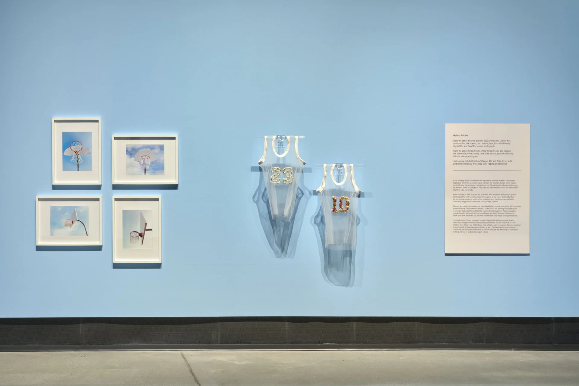 “Through a series of re-imagined basketball jerseys, Tolcher engages with the idea of the fadeaway as a metaphor for the loss of knowledge about the history of women’s sport. As women started playing basketball in the early twentieth century, women’s roles in society were limited and prescriptive. Bloomers made of long and delicate materials were deemed acceptable attire for women’s sports jerseys in the early 1900s. In her re-examination of women in sport, Tolcher uses tulle, organza, ribbon, and satin to create a series of women’s basketball jerseys to reference the construction of basketball jerseys from this time. Some of her jerseys are fashioned as floor-length gowns and elaborate blouses to draw attention to the impractical fabric and designs of women’s jerseys in the past and as a reminder of how far women’s basketball has come in the acceptance of women in professional sport. She also plays with the conventions of fashion photography through a series of photographs that show her jerseys worn by female models that emphasize how youth, beauty, and ability are idealized in fashion media.