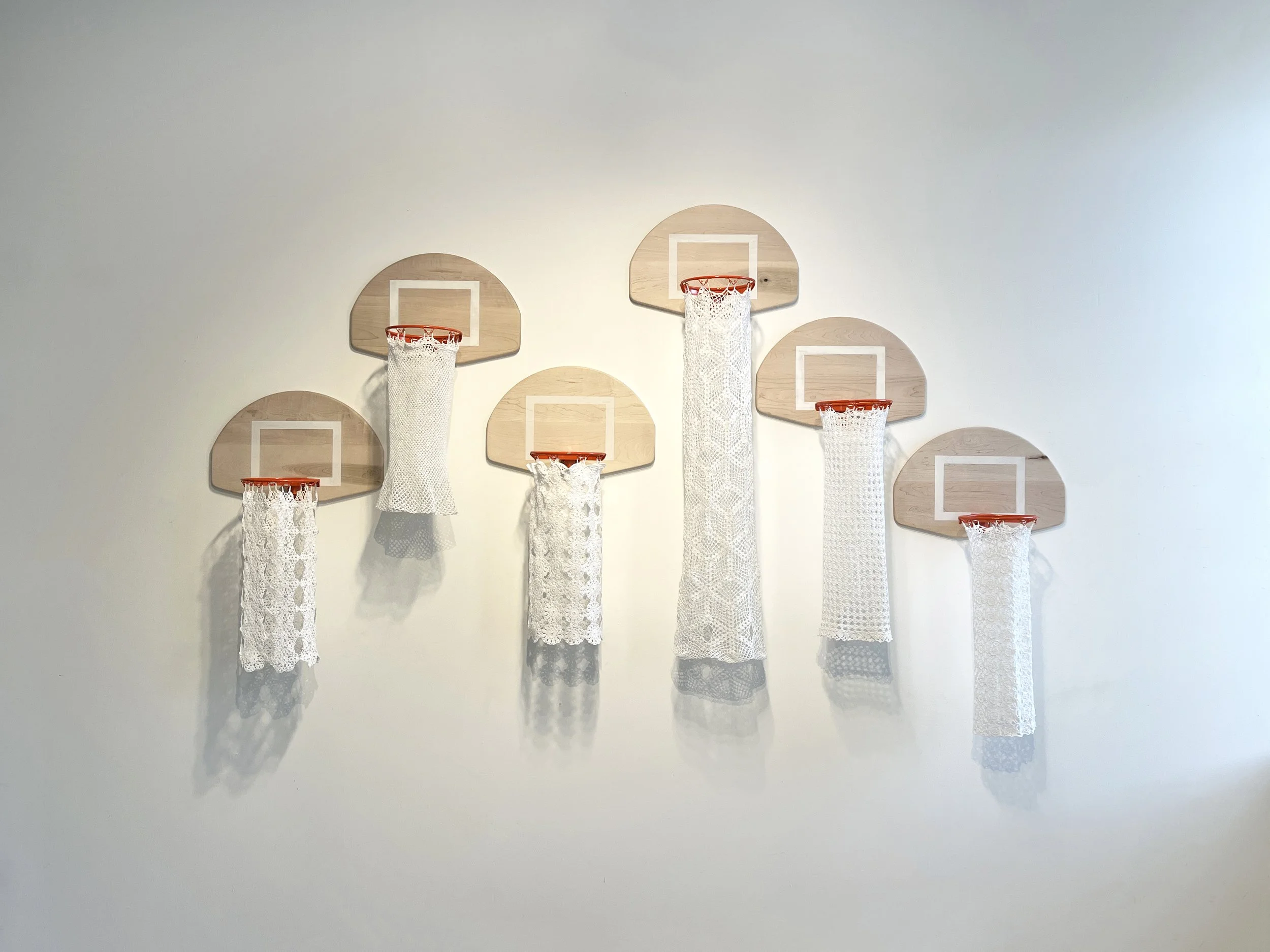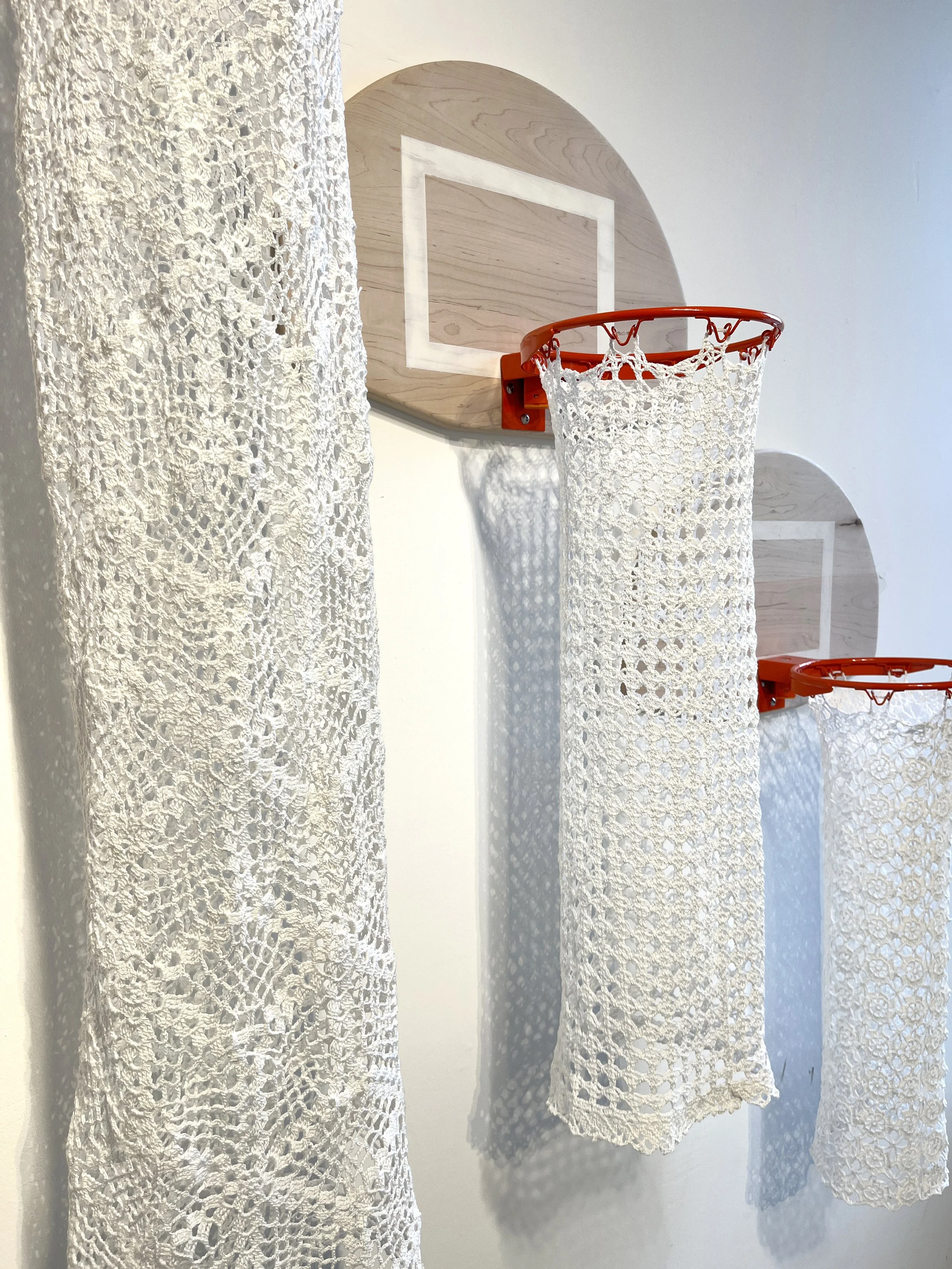 Through a series of textiles installed on metal rims and wooden backboards, Post Up reimagines the conventional basketball net through the intricate and domestic medium of crocheted lace.